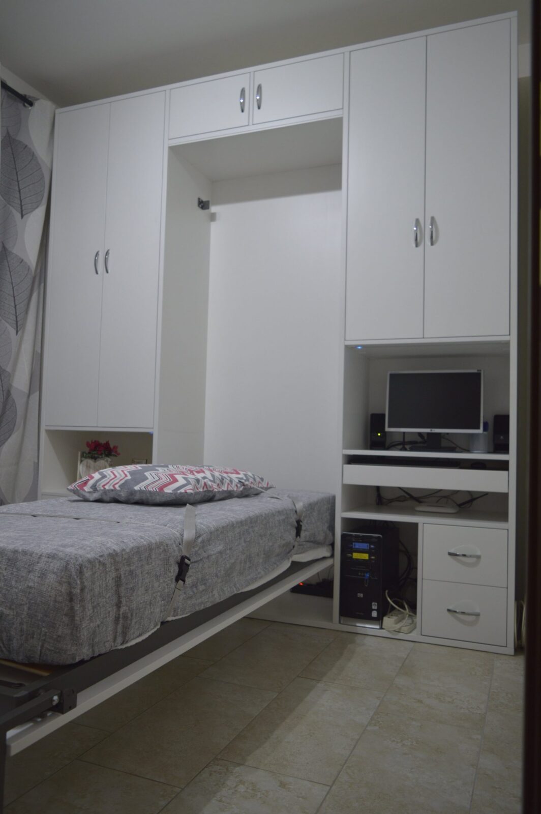 L’armadio a ponte con letto singolo a scomparsa è una realizzazione su misura: puoi scegliere dimensioni, elementi, disposizione e caratteristiche.