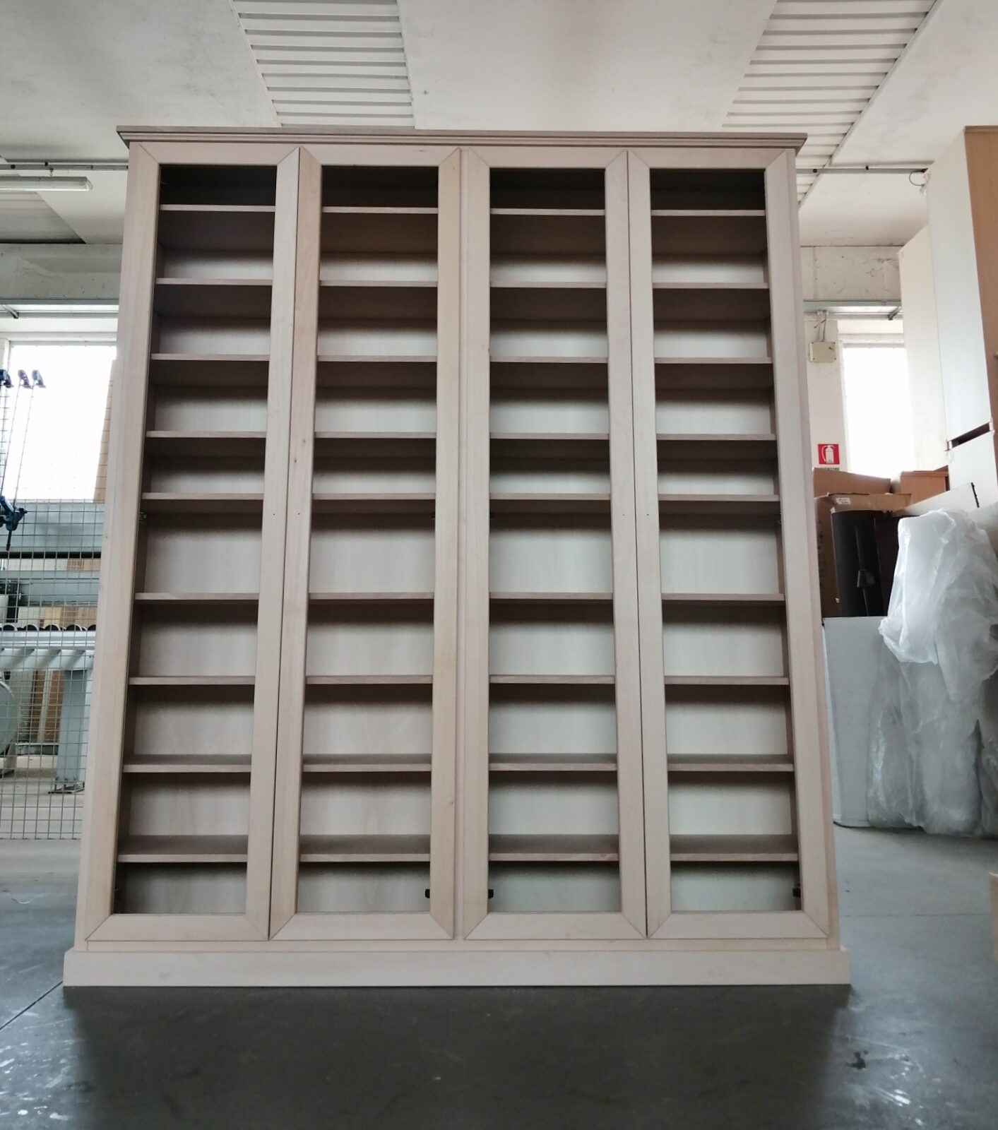 All’interno si trovano 9 ripiani in legno, ideali per organizzare ordinatamente scarpe, stivali o accessori, mantenendo ordine anche negli spazi più ampi. Le dimensioni generose (L 200 cm × H 230 cm) la rendono perfetta per corridoi, disimpegni o pareti attrezzate.