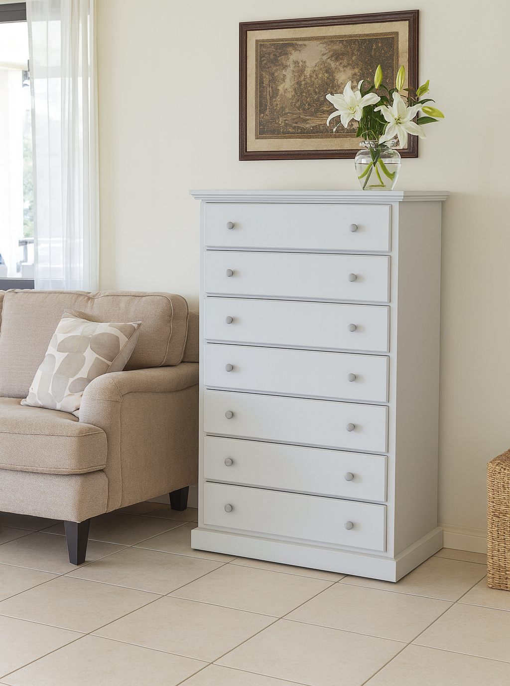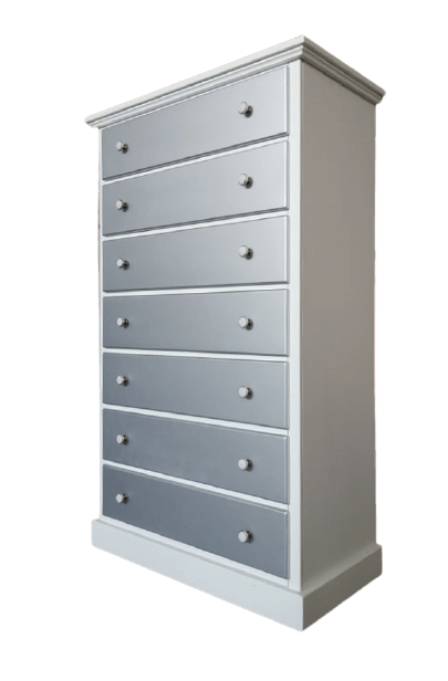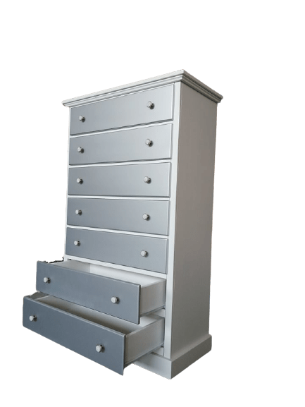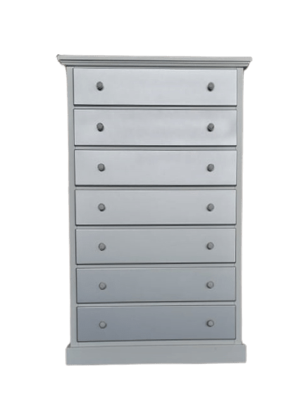 Un mobile elegante, versatile e capiente, perfetto per arredare con stile sia il salotto che la zona notte. Questa cassettiera in legno massello è realizzata artigianalmente con materiali di alta qualità, ed è dotata di 7 ampi cassetti con doppio pomello oppure maniglia centrale. La verniciatura opaca chiara la rende adatta ad ambienti moderni, nordici o classici rivisitati.