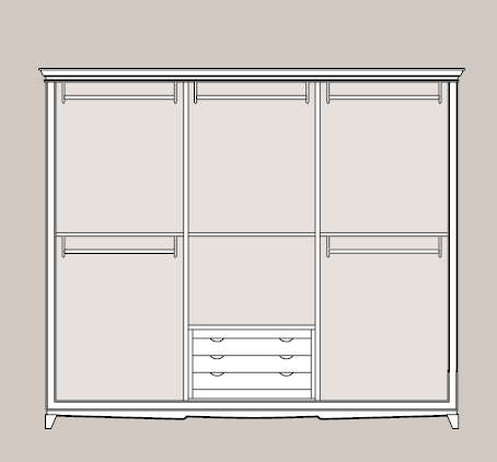 Interno:  l’armadio ospita una cassettiera a tre cassetti centrale,
