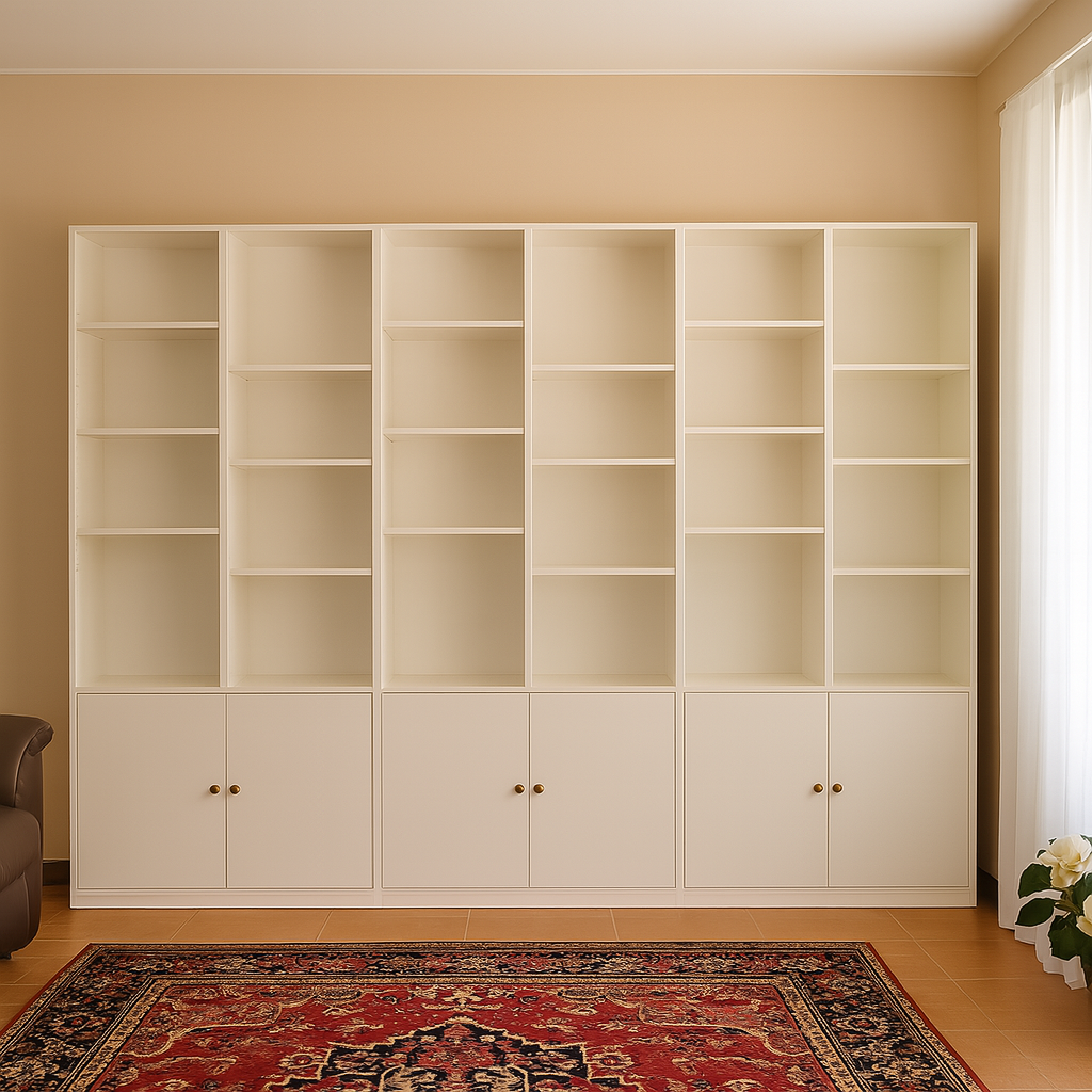 Con una larghezza di 300 cm, offre sei colonne verticali con ripiani regolabili per accogliere libri, oggetti decorativi o archivi, e sei ante inferiori battenti ideali per celare ciò che non si vuole lasciare a vista.