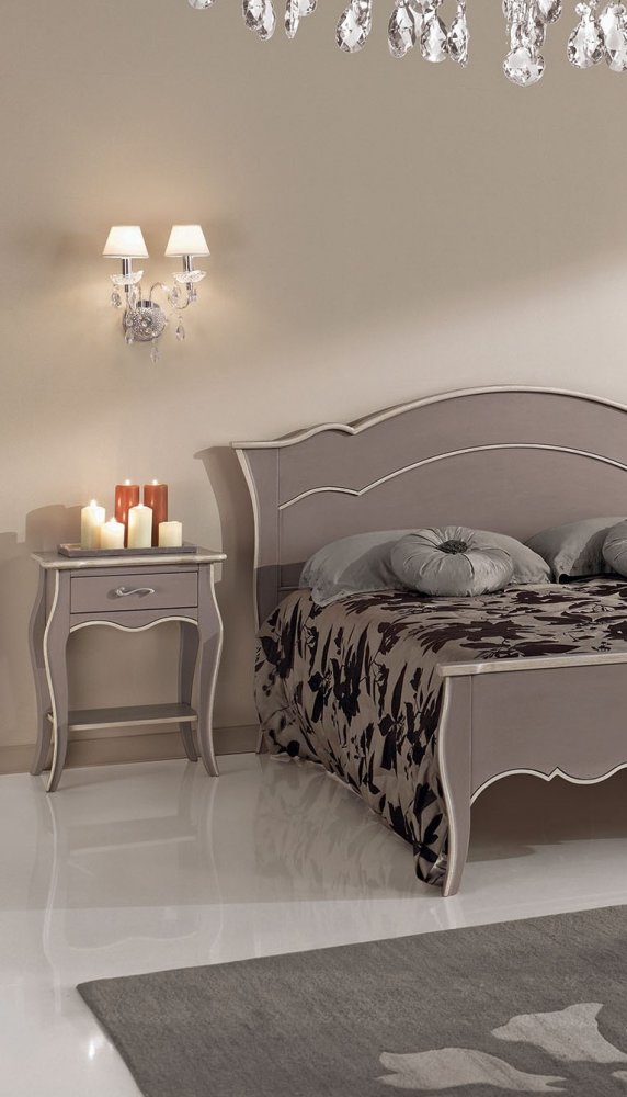 Molto carina l’idea d’inserire un pomellino nel comodino della stessa linea della maniglia, abbinando al meglio il set comò e comodini. - Letto sagomato a due piazze, interamente in legno massello come l’intera camera matrimoniale classica.