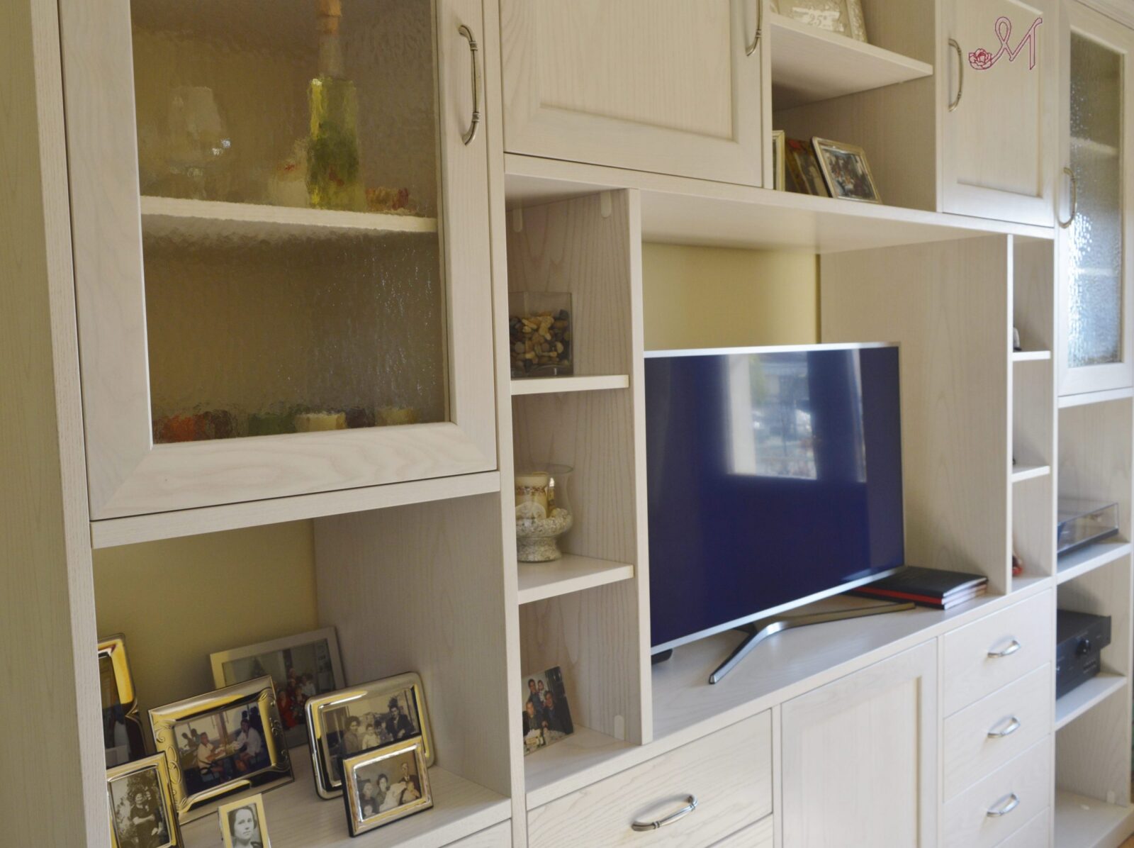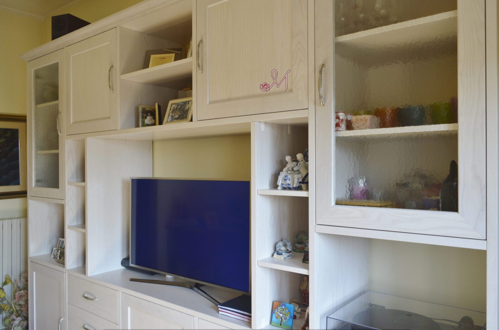 Parete attrezzata in legno frassino massiccio con stile classico ma con alcuni elementi di design che non appesantiscono troppo l’effetto finale della parete, proprio per questo, la scelta di alcuni dettagli come le cerniere nelle ante e non gli anuba, i cassetti sono anti-caduta e della finitura bianco venato.