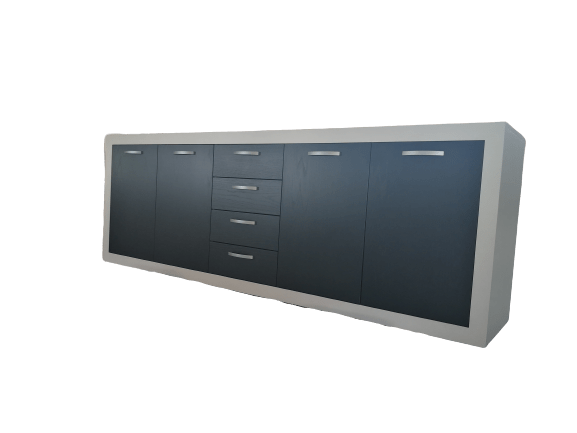 L’unione tra materiali di qualità, proporzioni simmetriche e una palette cromatica decisa rende questa madia un elemento di arredo dal forte impatto visivo.
