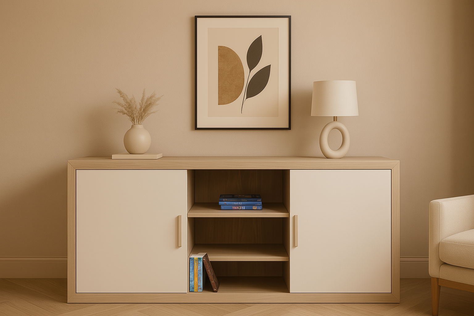 Madia Moderna in Legno Chiaro con Ante Laccate – Design Personalizzabile