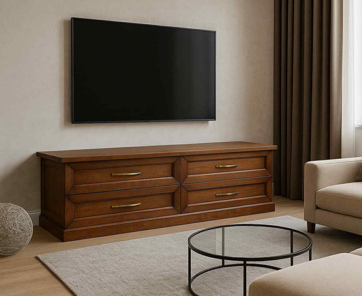 Questo elegante porta TV classico in legno massello è pensato per ambienti raffinati che richiedono qualità e stile senza tempo.