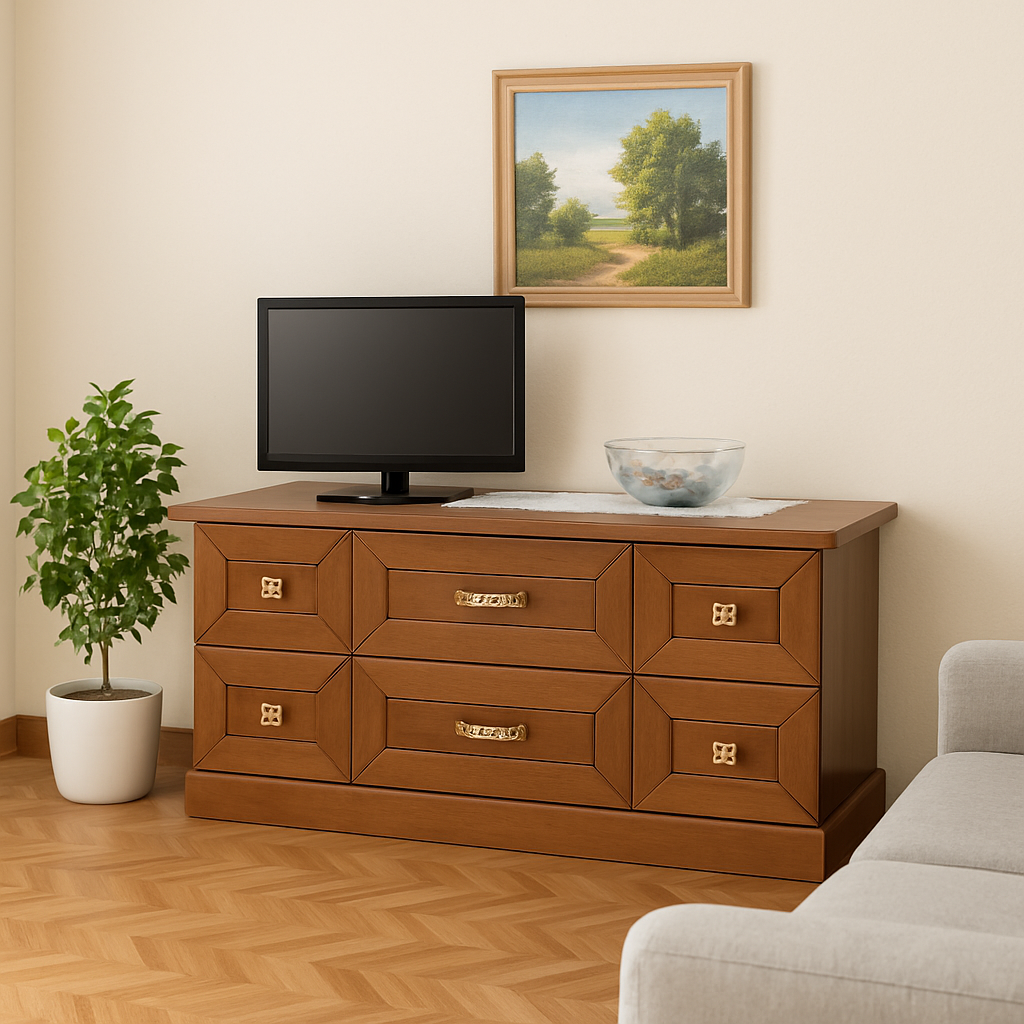 Il porta TV Art. 105 è pensato per chi cerca un arredo funzionale ma dal carattere deciso. I sei cassetti in legno massello offrono spazio e solidità, con un’estetica classica che si integra perfettamente in soggiorni eleganti e accoglienti.